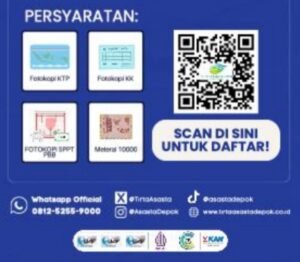 Bagi masyarakat yang ingin melakukan pendaftaran langsung di kantor pelayanan Tirta Asasta Depok terdekat, berikut persyaratan administrasi yang perlu disiapkan:• Fotokopi KTP• Fotokopi Kartu Keluarga (KK)• Fotokopi SPPT PBB terbaru• Materai Rp10.000Program ini berlaku khusus untuk wilayah yang telah tersedia jaringan pipa Tirta Asasta Depok, dengan syarat dan ketentuan yang berlaku.