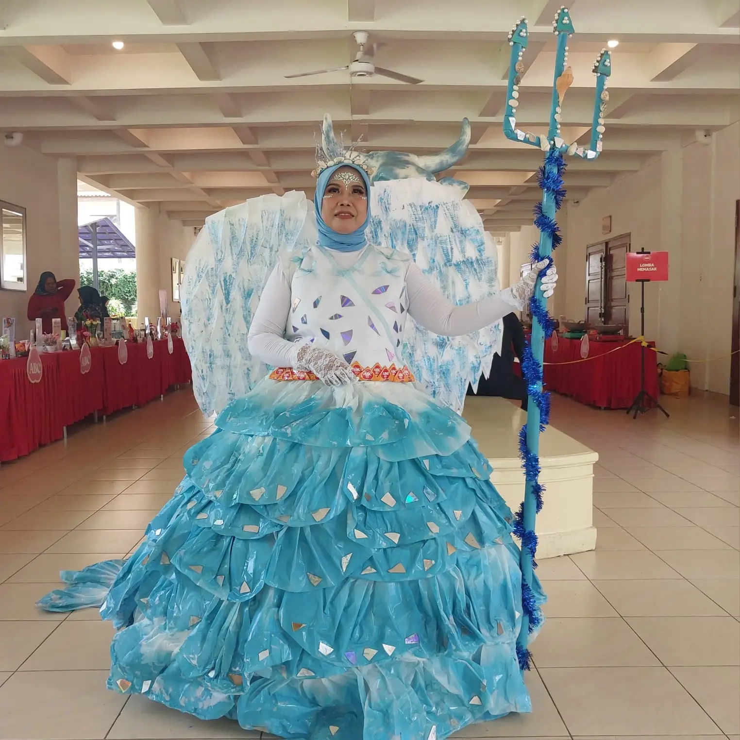 Salah satu penampilan yang paling memikat adalah kostum yang diperagakan oleh Ketua Tim Penggerak Pemberdayaan dan Kesejahteraan Keluarga (TP-PKK) Jatimulya, Supinah. Ia muncul dengan kostum bertema lautan dan es yang megah. Kostum ini memiliki sayap besar dan trisula di tangan, menciptakan visual yang sangat menawan dan memikat perhatian seluruh peserta di aula utama.